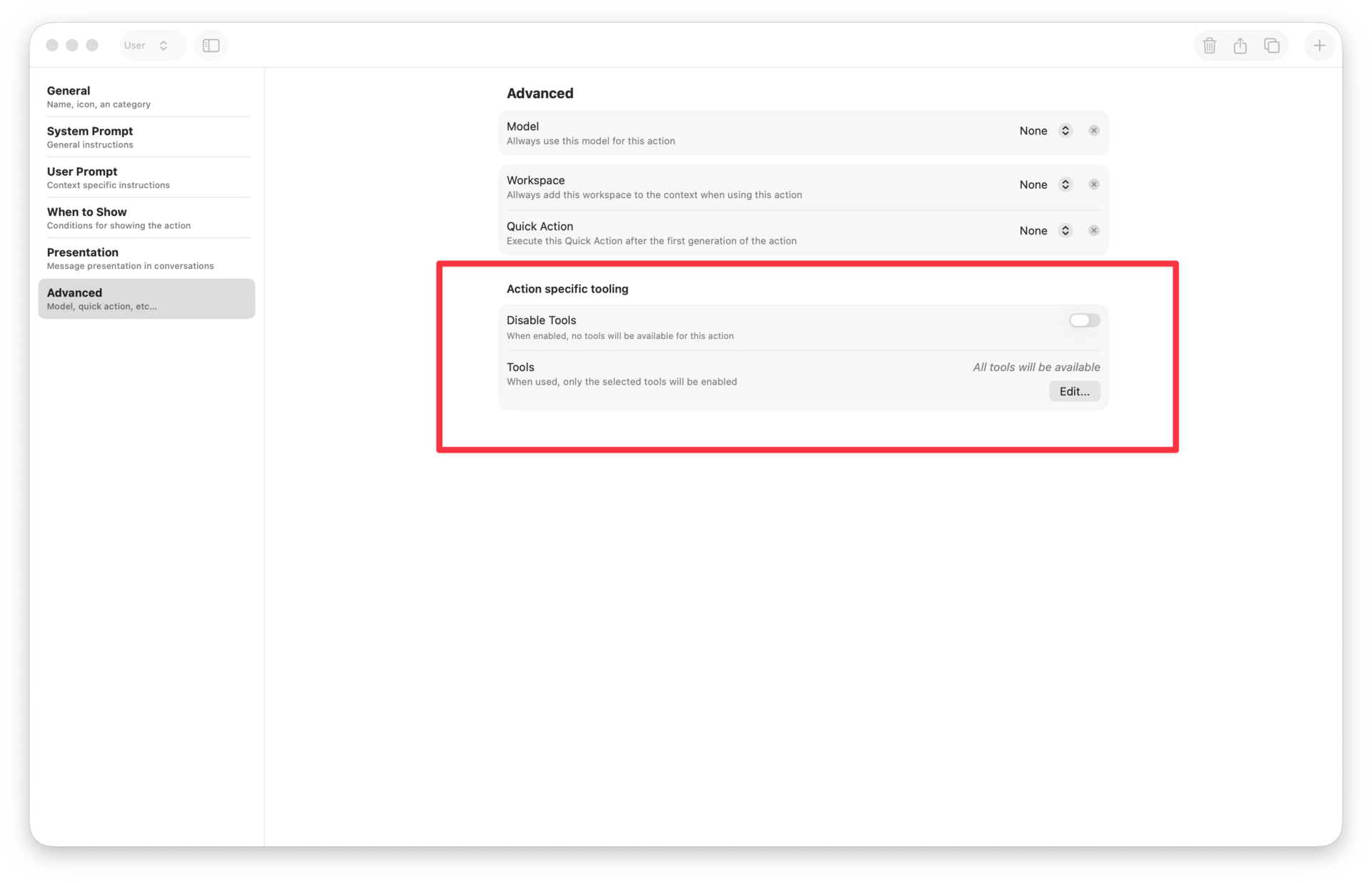 Define exactly which tools should be available. Create a calendar action? Only enable Apple Calendar and Google Calendar. No distractions, no mistakes.