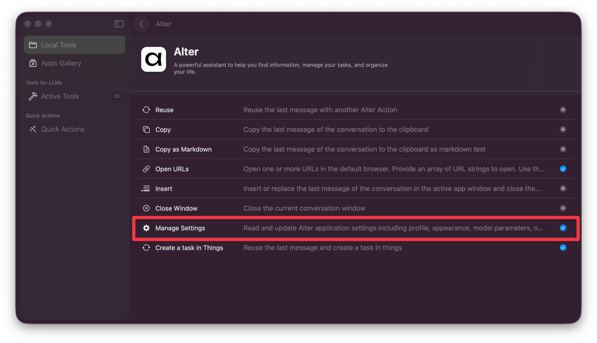 Manage Settings is a new Local Tool that lets you configure everything about how Alter works—through natural conversation.